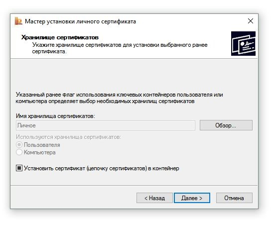 7. В следующем окне отметьте пункт Установить сертификат (цепочку сертификатов) в контейнер и нажмите Далее: