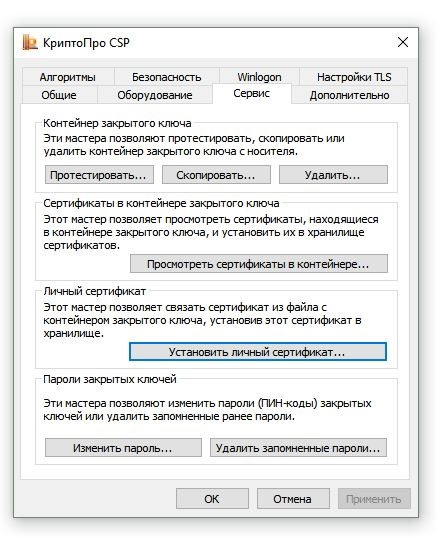 2. В окне программы КриптоПро CSP перейдите на вкладку Сервис и нажмите кнопку Установить личный сертификат: