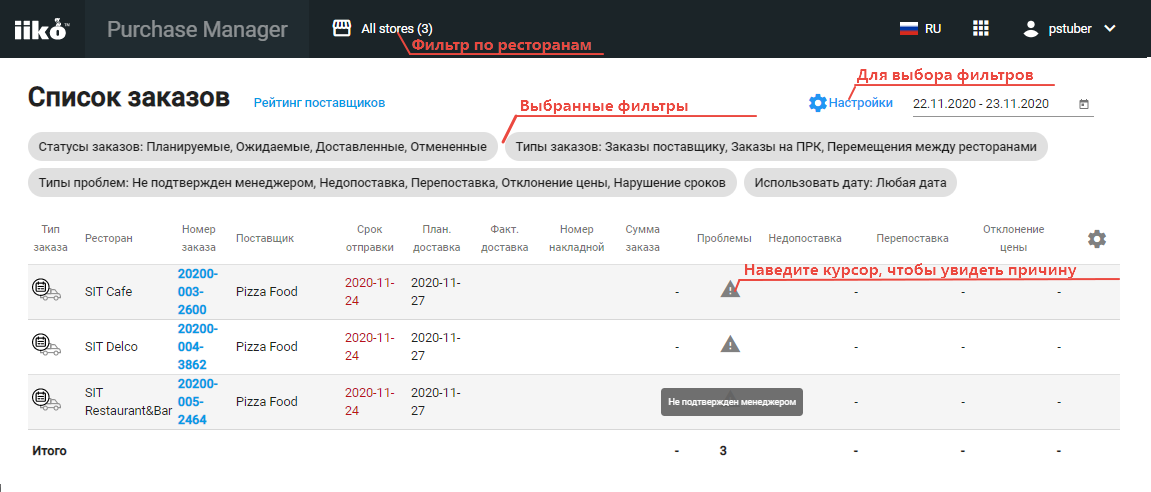 В Списке заказов можно увидеть текущие закупки у поставщиков, их статус и возможные проблемы.